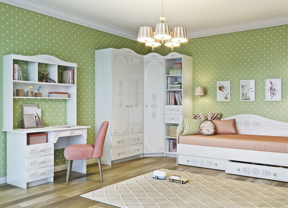 Единый стиль оформления модульной системы украсит детскую комнату ребенка. Рекомендуется использовать мебель для помещений со светлыми стенами, в сочетании с обоями под детскую тематику. Мобильность модульного конструктора позволяет разместить элементы мебели органично, не создавая трудности для проживания ребенка в своей комнате.