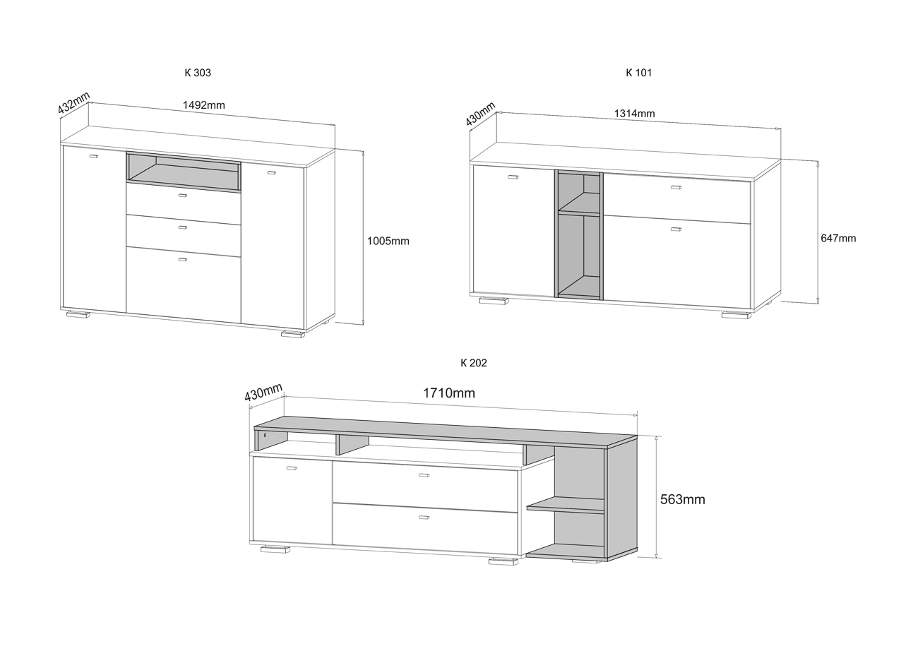 Размеры: К303 (ВxШxГ 1005x1492x432 мм); К101 (ВxШxГ 647x1314x430 мм); К202 (ВxШxГ 563x1710x430 мм)