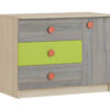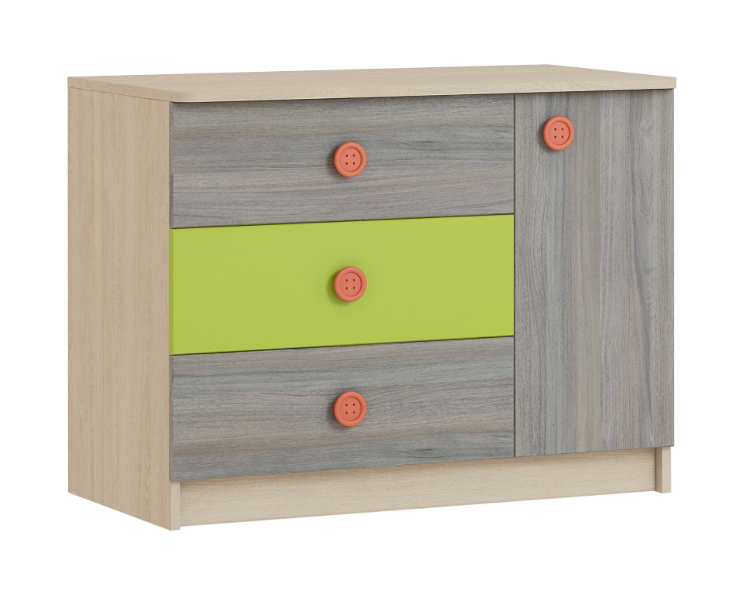 Комод для детской комнаты «Пуговка» — функциональное решение в интересном дизайне. Он точно понравится вашему ребенку. Каркас из ЛДСП в сочетании сдержанных бежевого и серого оттенков дополнен ярким зеленым цветом и необычной фурнитурой в виде замысловатых пуговиц. У комода «Пуговка» 3 выдвижных ящика и одна распашная секция с двумя полочками, а значит, сюда поместится много нужных и полезных вещей вашего чада.