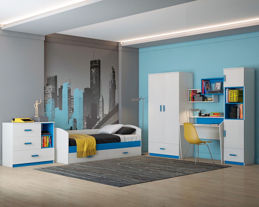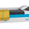 «Бирюза» — классический образец дивана-кровати с удобным боковым бортом. Он надежно защищает от холодных стен, а малышей еще и от падения, ведь многие дети 4-6 лет спят очень беспокойно. Изюминка модели — яркая бирюзовая полоса на корпусе. Такая же, как и у всей мебели серии «Бирюза». В сочетании с белым цветом каркаса она создает яркое настроение в детской. Корпус из ЛДСП прочен и надежен. За практичность отвечают два вместительных бельевых ящика. Они плавно выдвигаются из-под кровати и рассчитаны на размещение постельного белья, сезонных вещей и игрушек.
