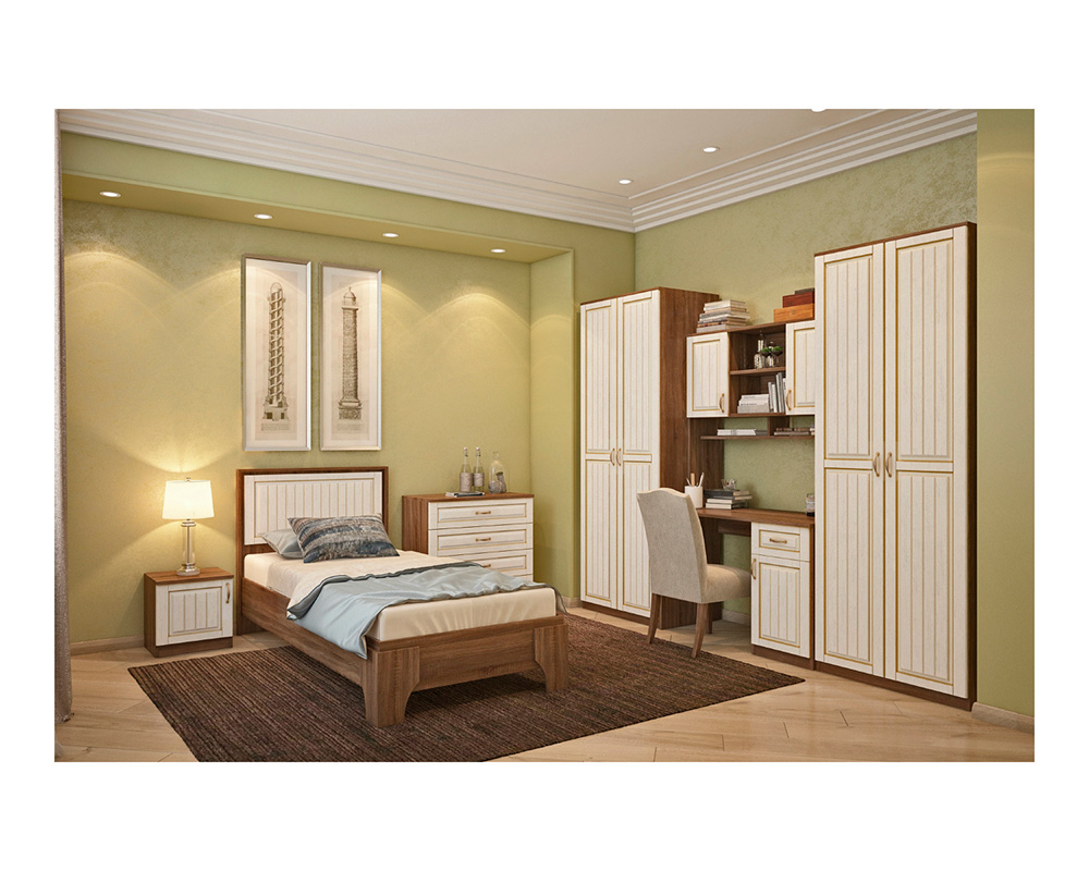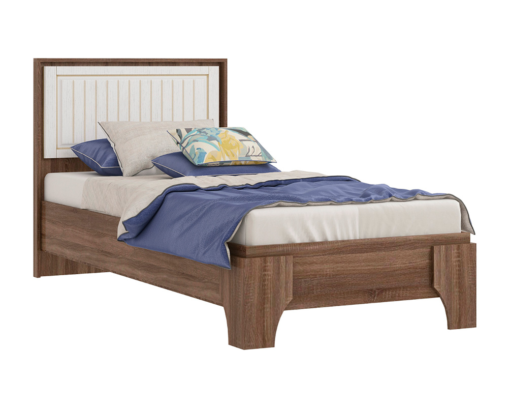 Односпальная кровать «Мишель» — модель с высоким изголовьем, отделанным декоративной фрезеровкой. Вертикально ориентированные вставки из МДФ визуально делают изголовье выше, а контраст вставок цвета патины с корпусом в цвете темного дуба подчеркивает элегантный образ мебели. Корпус опирается на массивное изголовье и две опоры в изножье. Такая конструкция обеспечивает кровати прочность и смотрится необычно. Основание под матрас вы можете выбрать на нашем сайте, оформив заказ одной доставкой.
