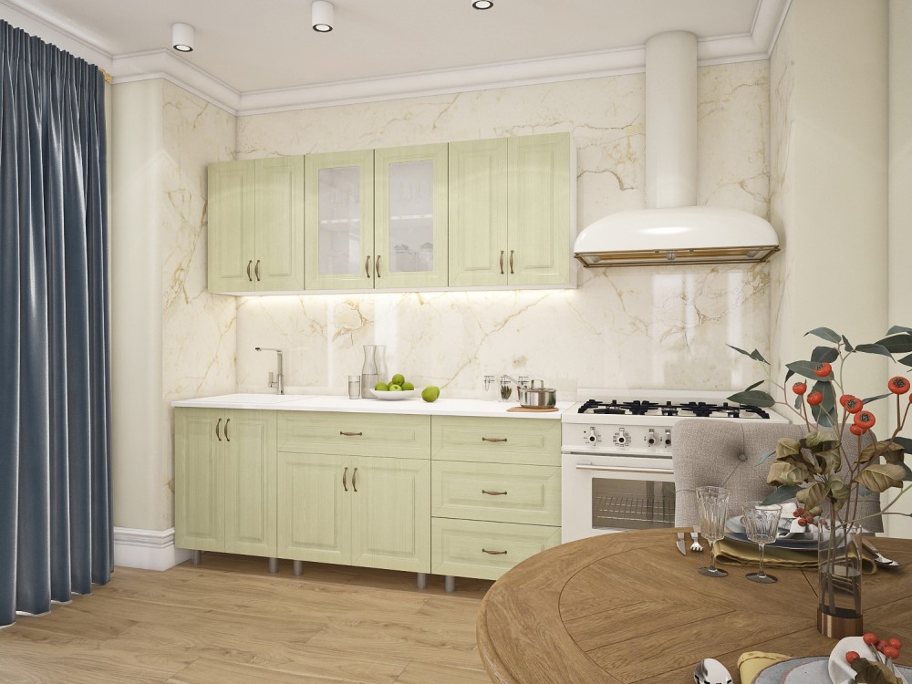 Перед вами изящный кухонный гарнитур в стиле прованс. Нежный, приглушенный фисташковый цвет фасада мягко перекликается с округлыми ручками под латунь. В шести модулях рационально скомпонованы ящичные и полочные решения, что позволяет компактно разместить посуду, расставить кухонный инвентарь и аксессуары. Кухня устанавливается на цилиндрические опоры с регулировкой по высоте. Закажите комплект с бесплатной доставкой по Омску или оформите самовывоз из гипермаркета в удобное для вас время.