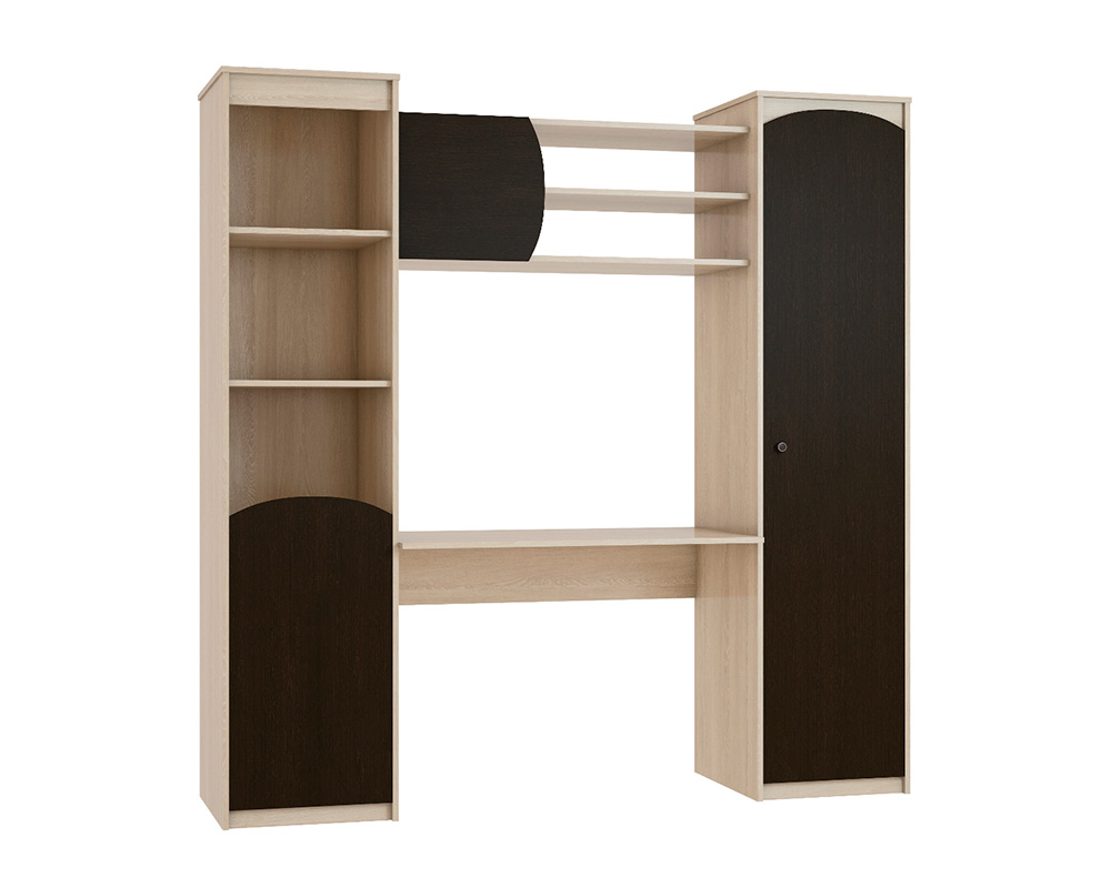 Мебель для комнаты «Ева» — часть модульного набора серии «Ева». Набор решен в двухцветном исполнении — фасады в оттенке венге, а корпус в цвете дуб сонома. В комплекте для детской два распашных шкафа, система полок и столешница, встраиваемая между шкафами. Благодаря такой расстановке комната четко делится на зоны для работы и отдыха, а систему шкафов и столешницу можно расположить у любой стены подходящей ширины. Другие элементы гарнитура «Ева» для обстановки детской или спальни вы найдете в каталоге нашего гипермаркета.