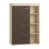 Это компактный шкаф комбинированного типа с открытыми полочками и закрытой частью. Высота шкафа всего 131 см, а ширина составляет 91 см. Благодаря своим габаритам он легко впишется в ваш интерьер. Однако во вместительности и функциональности шкафу нельзя отказать. Открытые полочки отлично подойдут для книг или домашнего декора, а в отделение, закрытое распашной дверцей, можно убрать множество нужных в быту вещей. Однодверный шкаф является составным элементом модульной стенки «Терра», выполненной в сочетании светлого (дуб сонома) и темного (бодега темный) оттенков коричневого. Ознакомиться со всей мебелью этой серии вы можете на нашем сайте.