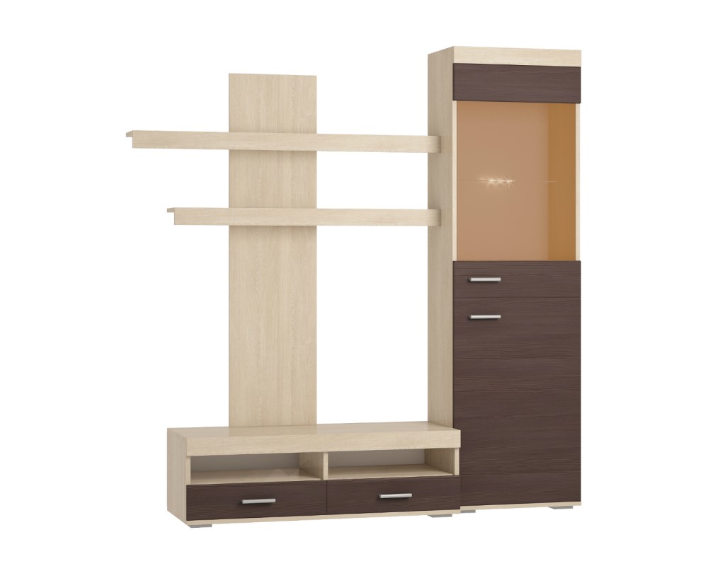 Эта стенка является центральной частью модульной коллекции мебели для гостиной «Терра». Дизайн всей серии в целом и стенки в частности концептуален, минималистичен, выдержан в современном стиле, но при этом не лишен изюминки: сдержанное сочетание классических оттенков «дуб сонома» и «бодега темный» дополнено вставкой из тонированного стекла. Стенка состоит из тумбы под телевизор, двух горизонтальных полок и компактного шкафа-витрины. Тумба оборудована двумя выдвижными ящиками, куда удобно будет убрать пульт, газету, журнал и прочие мелочи. Купить стенку вы можете на нашем сайте. Хорошая новость: доставка по городу Омск – совершенно бесплатно!